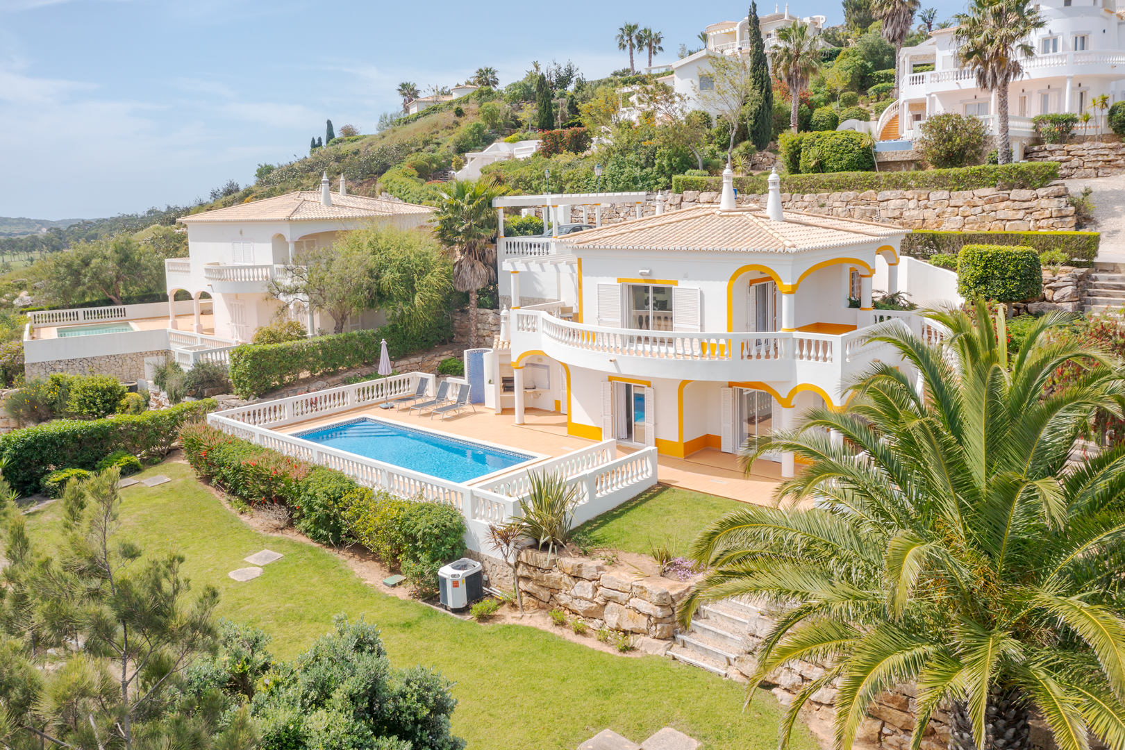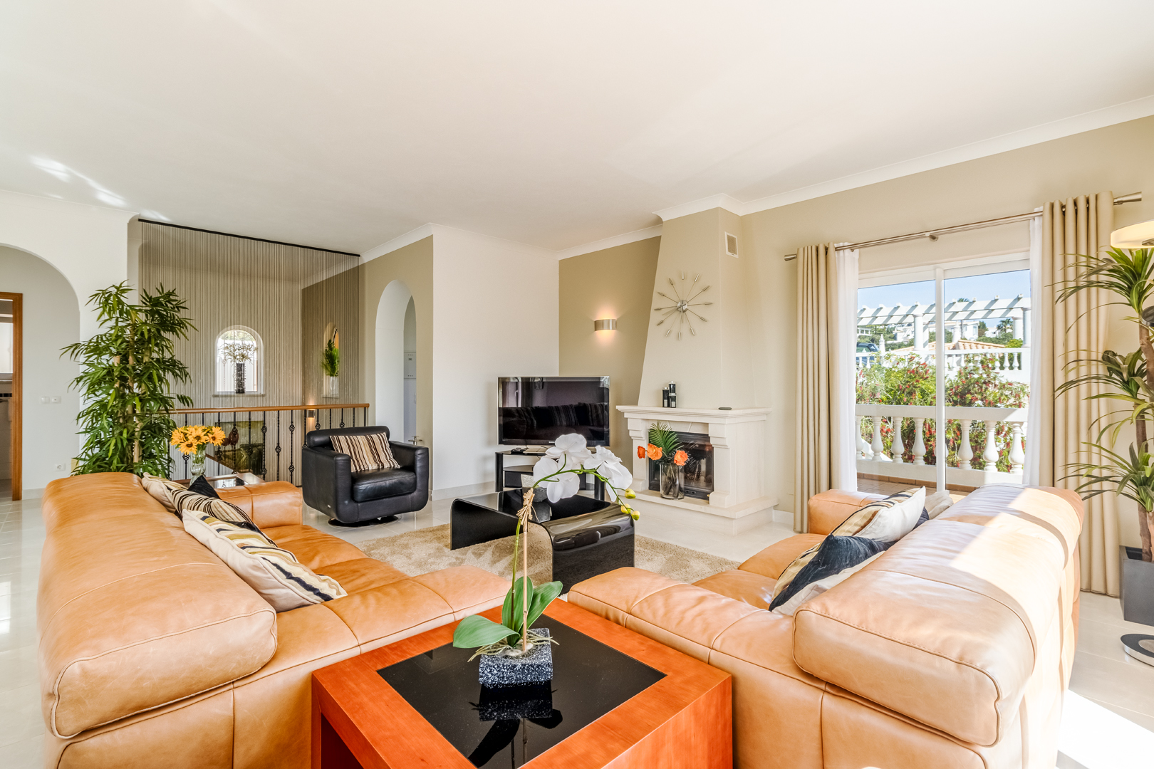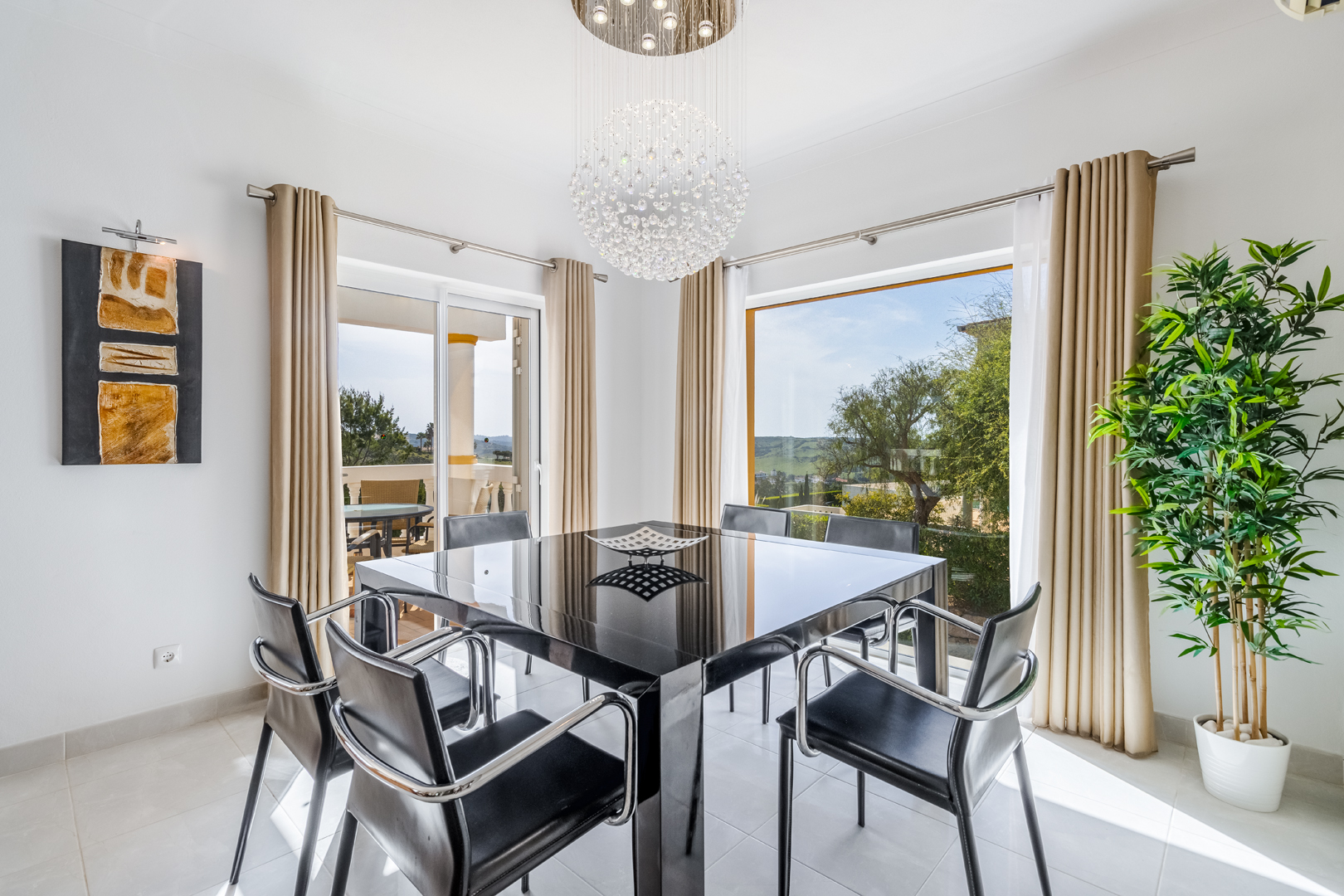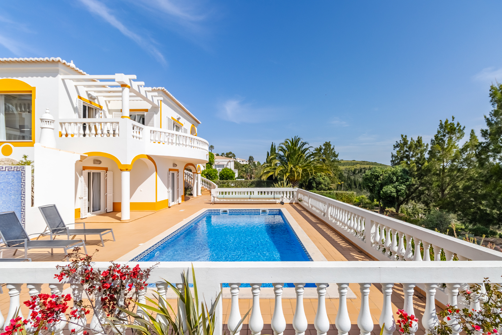 This stunning 3 bedroom villa is situated in a fabulous position on Parque da Floresta golf course with great views over the countryside and out to sea.The hallway leads you into a stylish open plan living and dining room with a huge wrap around terrace which makes the most of those panoramic views.The fully equipped kitchen is next to the dining area with an open archway so you can chat to your guests whilst preparing meals. There is also a guest toilet on this level.Downstairs there are 3 spacious double bedrooms, all en-suite and with fitted wardrobes.