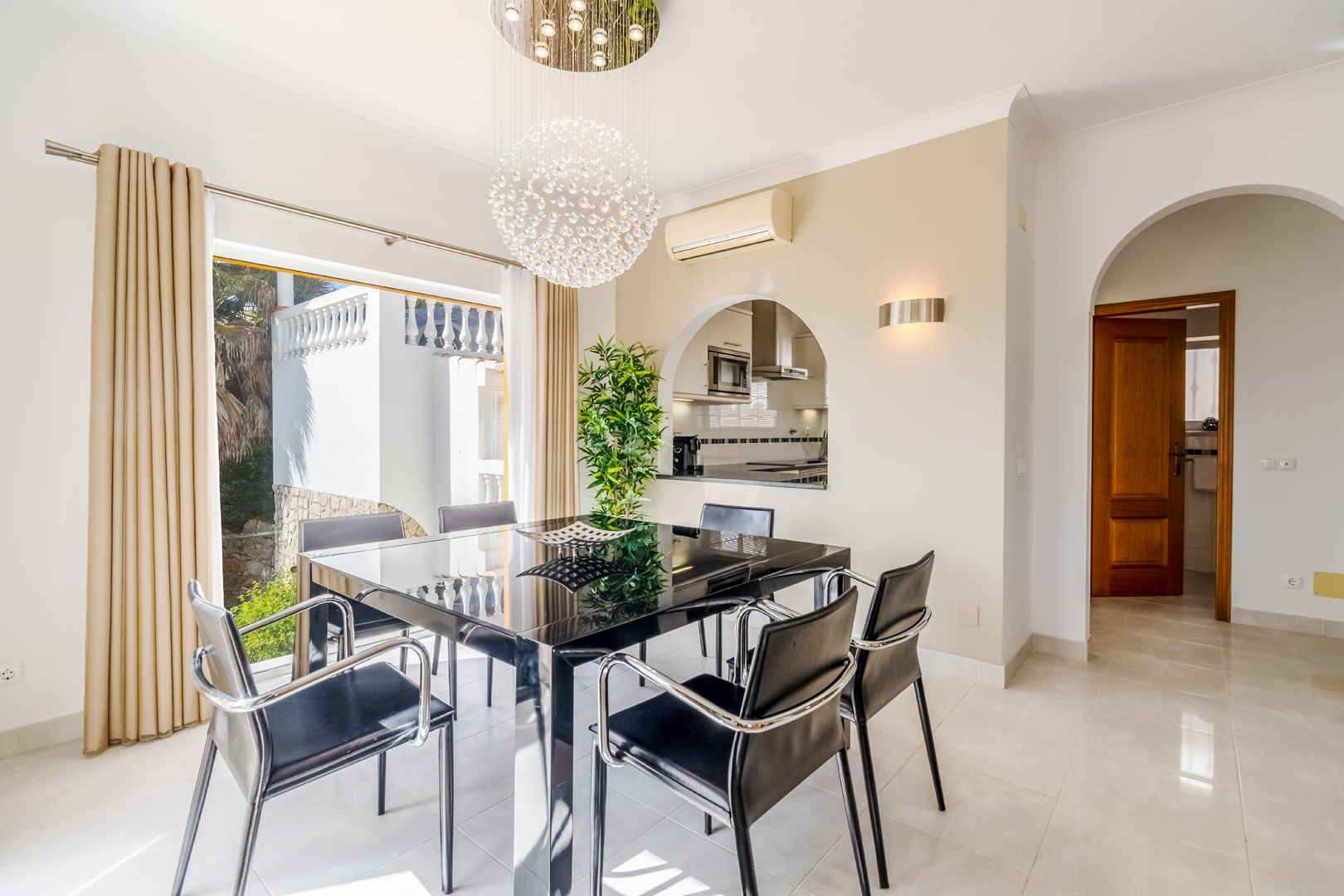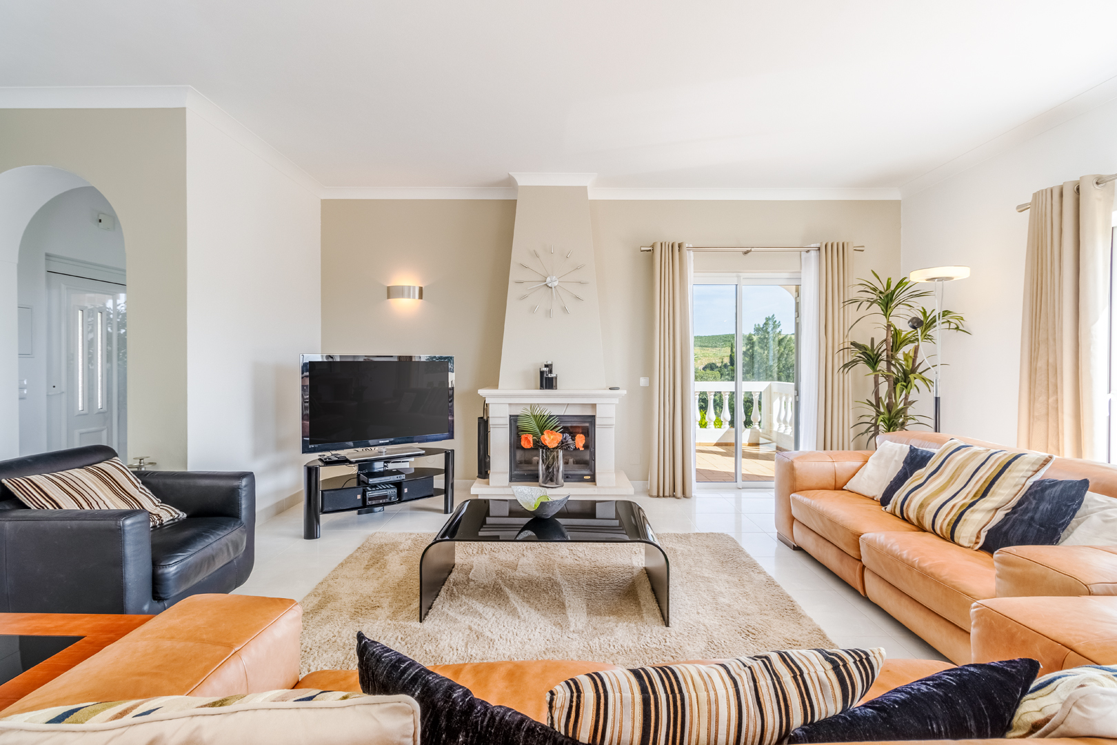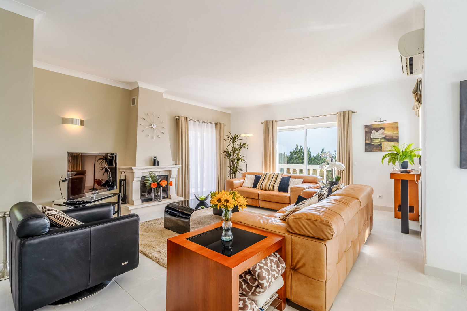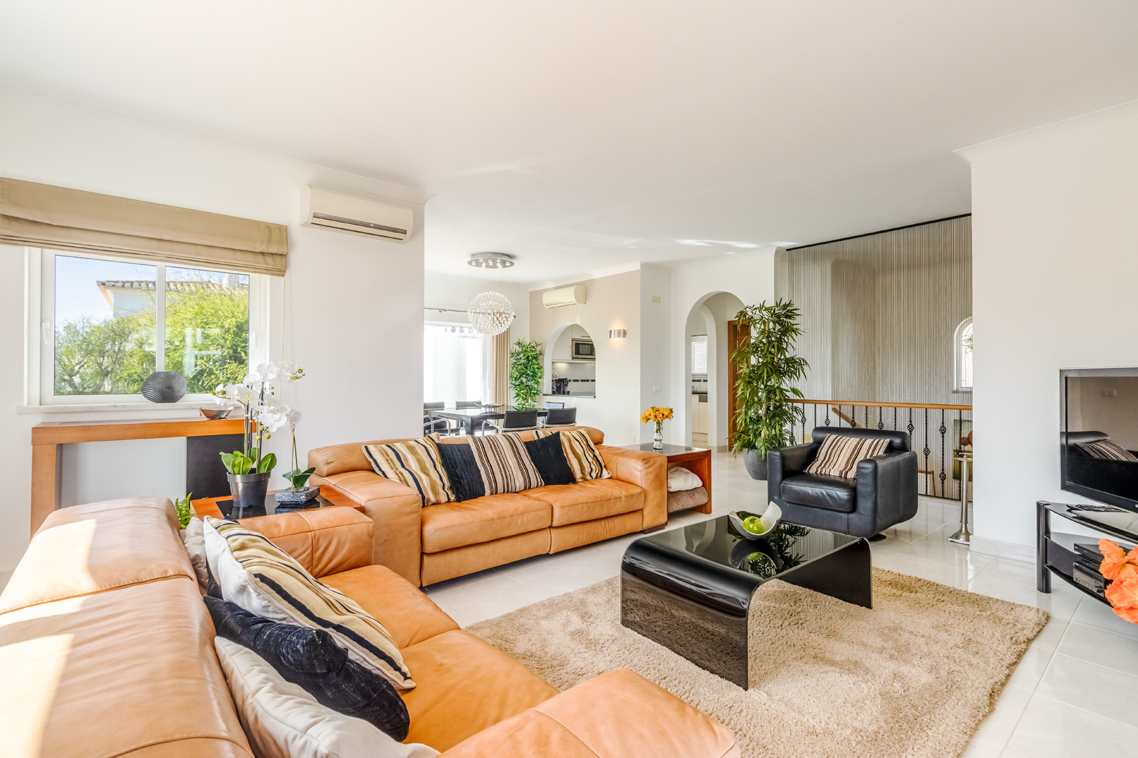 This stunning 3 bedroom villa is situated in a fabulous position on Parque da Floresta golf course with great views over the countryside and out to sea.The hallway leads you into a stylish open plan living and dining room with a huge wrap around terrace which makes the most of those panoramic views.The fully equipped kitchen is next to the dining area with an open archway so you can chat to your guests whilst preparing meals. There is also a guest toilet on this level.Downstairs there are 3 spacious double bedrooms, all en-suite and with fitted wardrobes.